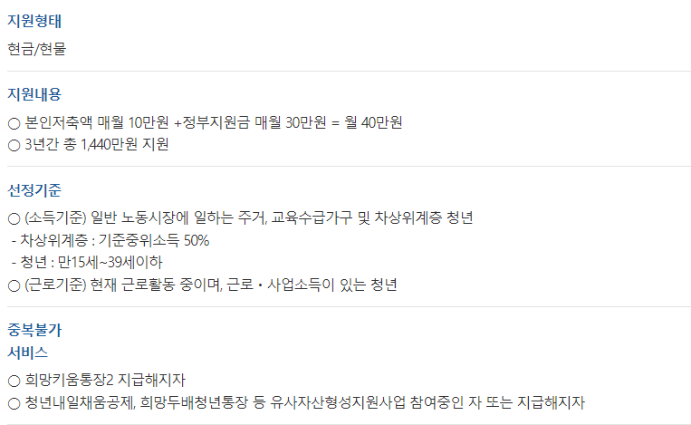 -청년이 매월 10만원을 통장에 넣으면 + 정부에서 지원금으로 매월 30만원을 입금하는 형태