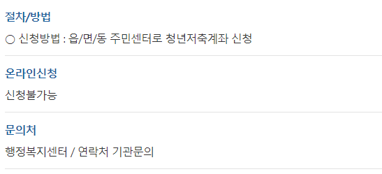 청년저축계좌 신청 방법은 어떻게 될까요? 대부분의 제도들은 온라인 신청이 되는데, 청년 저축계좌 신청은 온라인 신청이 불가합니다. 신청을 위해서는 읍/면/동 주민센터로 청년저축계좌를 신청하셔야 합니다. 자세한 내용은 아래 사이트에 들어가셔서 확인하시길 바랍니다.