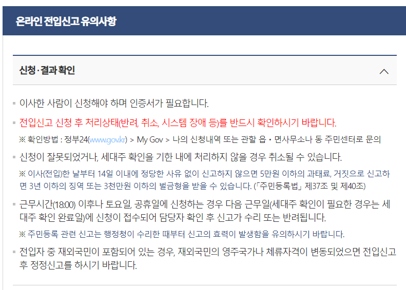 온라인 신청은 중간에 오류가 나서 처리 완료가 안 될 수 있기 때문에, 신청 이후에 3시간 정도 기다려보고 처리 상태를 꼭 확인해주셔야 합니다. 만약 오류로 인해 전입신고가 안 될 경우 나중에 보증금 같은 것을 보장 받지 못할 수 도 있습니다.