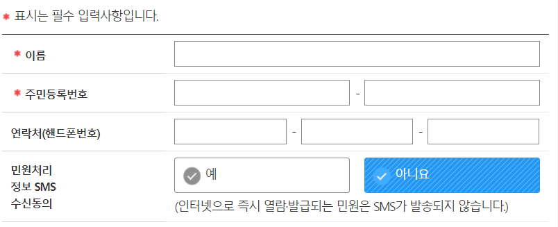 전입신고 신청 페이지로 넘어가면 다음과 같은 정보들을 기재해주셔야 합니다. 이름과 주민번호를 넣어주세요.